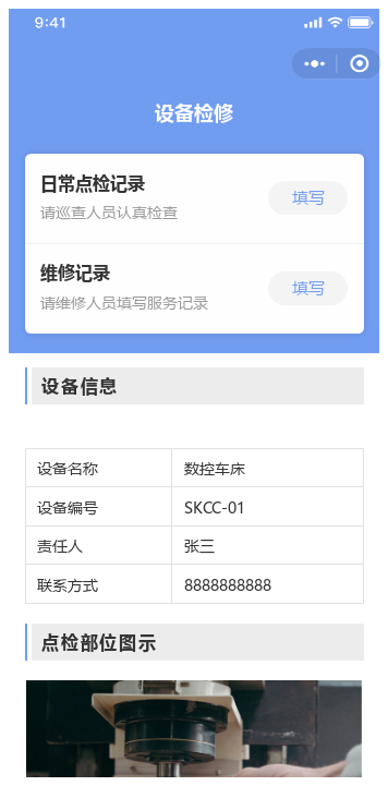 通过机智熊二维码平台的【设备检修报告单】模板,您可为每台关键设备生成专属二维码,张贴于机身或附近醒目位置。相关人员扫码后,即可按需填写: