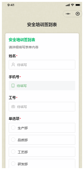 填写姓名、工号、所属部门/班组、手机号等信息;