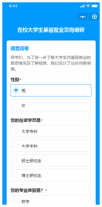 随着国家持续推进乡村振兴、社区治理和公共服务均等化战略,引导高校毕业生到基层就业已成为重要政策方向。然而,高校就业指导部门在开展基层就业意愿摸底时,常面临问卷回收率低、数据汇总繁琐、信息真实性难保障等问题。传统的纸质问卷、邮件链接或微信群接龙,不仅效率低下,还难以激发学生认真作答的积极性。